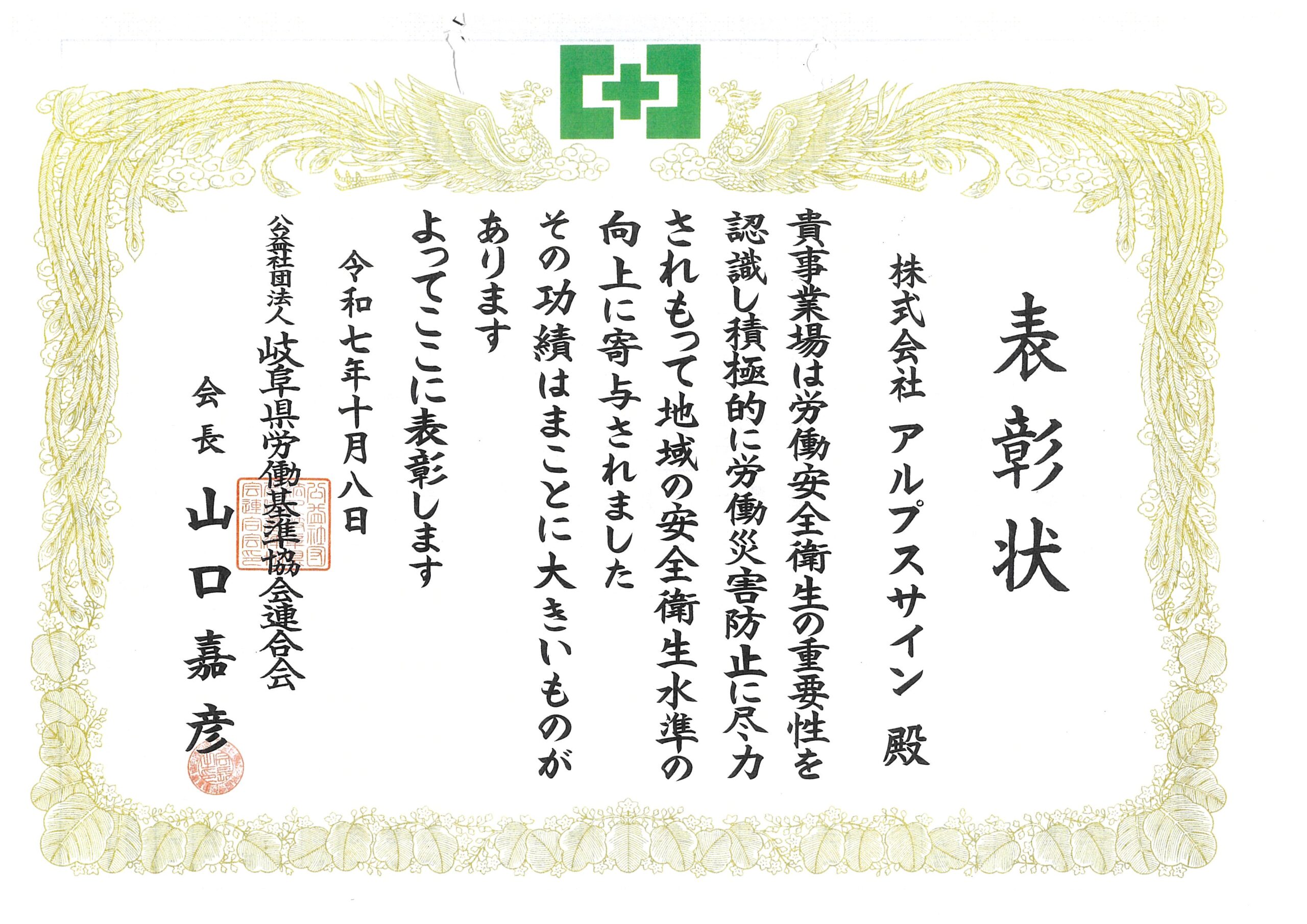 「公益社団法人 岐阜県労働基準協会連合会」様より、地域の安全衛生水準の向上に寄与した功績に対して、表彰状をいただきました。